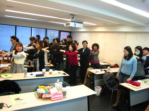 下午上課是最累的,沒關係,大家起立,用"火車式按摩"幫各自都"馬兩節"。