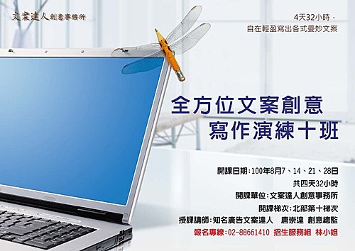 文案達人北部「8月全方位文案寫作演練十班」 「兩期月付文案輕鬆學」優惠方案 ◎ 13堂文案創意寫作Know-how傳授+ 7堂文案寫作演練課+ 500頁講義+4天午餐,原價 $11,200元,超優特惠價只要5,800元,並可分兩期月付,七月二十日前兩人聯報,每人優惠價只要5,600元。〈文案教授課程最完整,學費比市「授」價至少實惠五千元以上。〉 ◎ 開班人數15人。 ◎ 上完本套課程,到課率達八成以上,頒發本課程結業證書。 ◎ 以上費用均不含稅。 授課地點: 中國文化大學推廣教育部大新館401教室〈地址:台北市延平南路127號。捷運板南線西門站3號出口出站,經遠東百貨於寶慶路及延平南路口右轉,走路僅要5分鐘〉 報名方式: ◎電話報名–請撥(02)8866-1410,向本事務所林小姐報名。 ◎e-mail報名–請複製本部落格左下方之「文案達人報名表」欄位或點選文案達人創意事務所網頁之報名表http://www.copywriter-study.tw/,以e-mail傳至tangcd2002@hotmail.com或tangcd2002@yahoo.com.tw信箱。 繳費方式: 1. 以e-mail報名或部落格報名後,我們會以電話與您聯絡確認後,請運用金融卡以〈ATM〉轉帳繳費,帳號07-0001-03054-1;收款銀行─台灣銀行代號:004。 2. 完成繳款後,請將繳費的ATM交易明細表影印傳真至〈02〉8866-1410確認,或打電話通知,或以e-mail確認〈請告知大名、手機號碼、付款金額、匯款日期、存摺帳號後 四碼 〉。在完成銀行入帳確認後,我們會再以電話通知您, |