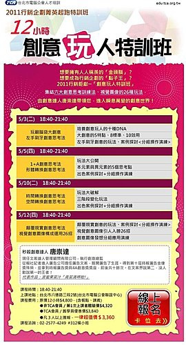 為此我特地與台北市電腦公會攜手,在6/15,6/17,6/22,6/24的週三及週五晚間,為有心玩創意,也想用創意點燃生意的朋友加開這堂課。