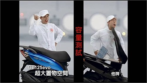 ▲圖三:雖是不脫俗套的運用「捧己損敵」分割比較式畫面,但在嬉笑消遣對手之餘,至少能做到不口出酸言惡語,也算比的還有格調。容量測試中,座墊打到浩子的臉之畫面,雖有刻意矮化對手(應該是Y牌勁風光)的意味,卻損的挺有趣的。