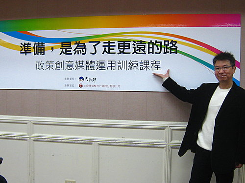 圖一:如同這塊背板上所寫的-「準備,是為了走更遠的路」,我之所以一口就答應來內政部授課,無非也是想讓往後的內政部政策宣導廣告,走出面貌一新的路。