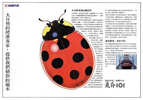 ↑圖文說明:飛羚101造車創意系列的第二張廣告稿,是強調飛羚101亮麗烤漆的瓢虫篇,比喻飛羚身上披上了一層像大自然烤漆專家般的西德DURR鮮明亮麗烤漆。圖像一樣是用手繪插圖來表現百科全書般的知識感!