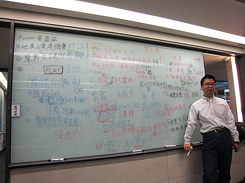 ↑圖文說明:學員上台寫完後,老師也不能漏氣喔!必需上台拿出「現寫現改」的功力,針對學員所寫的優缺進行刪修潤飾,將滿滿白板上大家所寫的習題,變成一個個有吸睛力又有銷售力,又讓大家服氣的標題!