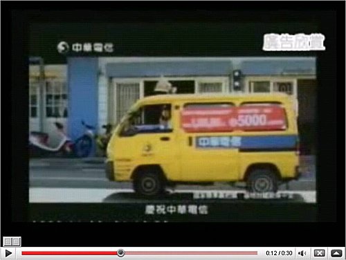 圖文說明:中華電信「鴨尾仔巴結茂伯篇」手機廣告TVC的片尾,中華電信的宣傳車司機一手開車,一手拿麥克風,車也停在大馬路上做生意,也是公然違反交通規則,請問NCC諸公是否也要比照辦理,發函各頻道讓它在21:00以後播出呢? 欲收看中華電信「鴨尾仔巴結茂伯篇」TVC,請點選http://tw.youtube.com/watch?v=BT9wFvNBN5o&feature=related 圖文說明:若是廣告片中只要有違反交通規則的片段,都必需在晚上九點半後才能播,那國外這支普利斯通輪胎廣告片,演出拉布拉多狗跑到高速公路上要撞車自殺,情節還更嚴重,人家外國怎沒祭出限制令? 欲欣賞普利斯通輪胎「情狗自殺」篇TVC請點選http://tw.youtube.com/watch?v=yJK6NAvc8q8&feature=related