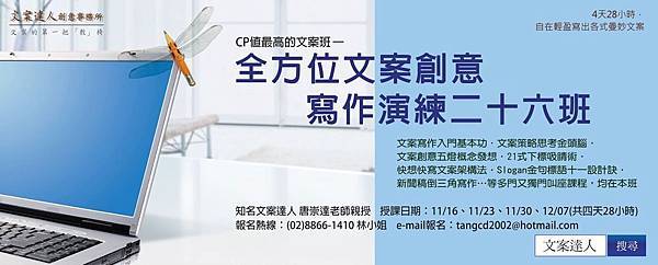 文案達人名師唐崇達專業傳授,全台上千文案學員叫好推薦 文案達人2014十一月北部「全方位文案寫作演練26班」課程表 上課日期:11/16, 11/23, 11/30, 12/07(週日) 09:00~17:00 |