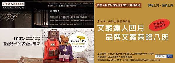 讓品牌雲開見日,豁然成型,真正成為替您賺錢的搖錢樹,每梯開班、必然滿班的「文案達人品牌文案策略魔法班」,將於4/11, 4/18, 4/25, 5/2等四個週六推出「文案達人品牌文案策略魔法八班」,將是您品牌點石成金不可錯過的文案魔法棒。