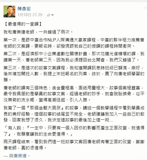 ▲業界名師陳彥宏老師,上完文案達人唐崇達老師的故事行銷文案寫作二班後,在fb所表的心得與感言,以標題【最值得的一堂課】大讚這堂課。