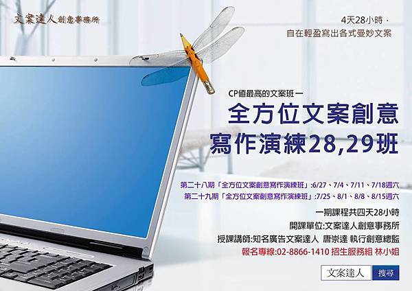 文案達人北部2015 「六月全方位文案寫作演練28班」 「七月全方位文案寫作演練29班」 「兩期付款」優惠方案 ◆ 9堂文案創意寫作Know-how傳授+ 5堂文案寫作演練課+ 350頁講義+4天午餐,原價$11,200元,超值特惠價只要$6,600元(未稅),並可分兩期付款(報名時先付一半,另一半開課當天繳清),大學應屆畢業生,憑畢業證書,可享九五折優惠。兩人以上聯報,每人優惠價只要$6,400元。(市面上絕無僅有的有料課程+超值價格) ◆開班人數15人,滿班人數30人。 ◆四天完整上完本套課程,頒發文案達人唐老師親筆簽名的結業證書。 ◆以上費用均為未稅價。 ◆本課在報名繳費,從開課與講義印製後,均不得再以任何理由要求退費。 授課地點: 中國文化大學推廣教育部大新館401教室〈地址:台北市延平南路127號。捷運板南線西門站3號出口出站,經遠東百貨於寶慶路及延平南路口右轉,走路僅要5分鐘〉 報名方式: ◆電話報名–請撥(02)8866-1410,向本事務所林小姐報名。 ◆e-mail報名–請複製本部落格左下方之「文案達人報名表」欄位或點選本文下方之報名表http://www.copywriter-study.tw/hot4.html,複製填寫後,以e-mail傳至tangcd2002@hotmail.com或tangcd2002@yahoo.com.tw信箱。 繳費方式: 1. 以e-mail報名或以部落格報名表報名後,我們會以電話與您聯絡確認後,請運用金融卡以〈ATM〉轉帳繳費,帳號07-0001-03054-1;收款銀行─台灣銀行代號:004。 2. 完成繳款後,請將繳費的ATM交易明細表影印傳真至〈02〉2838-3894確認,或打電話通知,或以e-mail確認〈請告知大名、手機號碼、付款金額、匯款日期、存摺帳號後四碼〉。在完成銀行入帳確認後,我們會再以電話通知您,並告訴您梯次及座次編號。 3. 聯絡人:文案達人管理顧問有限公司招生服務組林小姐,服務專線〈02〉8866-1410,公司地址:台北市中山北路六段274號2樓