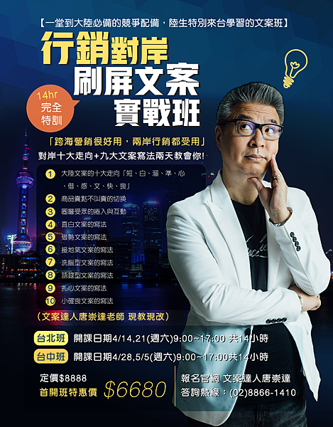 歡迎您即刻到文案達人唐崇達創意事務所官網的課程專區報名 課程問題諮詢專線 02-8866-1410